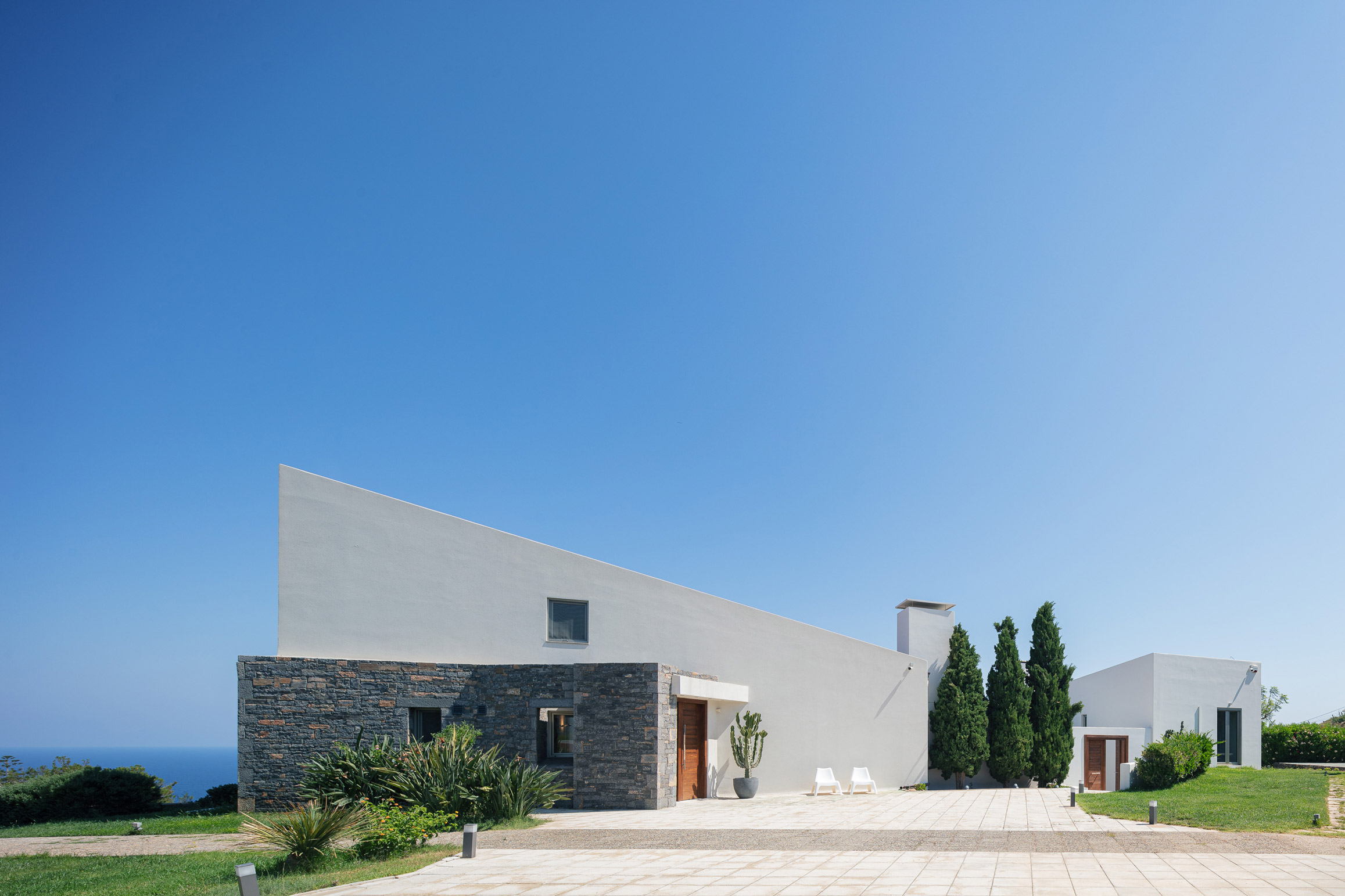 Rising from the ground in a statement of architectural glory, this lavish villa is the ultimate luxury pad for your dream family gathering. Designed with film set scenery in mind & with surreal art this unique home has it all ! Be whisked away into a world of utter extravagance at this flamboyant large one acre retreat in the sea side Agia Pelagia, only a ten minutes drive from Heraklion lively city. Award wining for its design & settled within poetic scenery this is a dream holiday choice that you & your loved ones won’t ever want to leave. The House fuses inspirational exteriors with a sea view setting, providing the sanctuary you crave for a together-time retreat. From summer days spent lounging by the pool to atmospheric evenings huddled around the outdoor dinning area, this luxury self-catering home in Crete was designed with ultimate care by the homeowner. With plenty of space for the whole family to unfurl in, here is a home where loved ones ( can host up to 10 guests) can set themselves free. The luxury sea view villa features two separate homes each with their owner open plan kitchen and living room. Both homes are connected with a luxurious lower lever wellness and entertainment area.